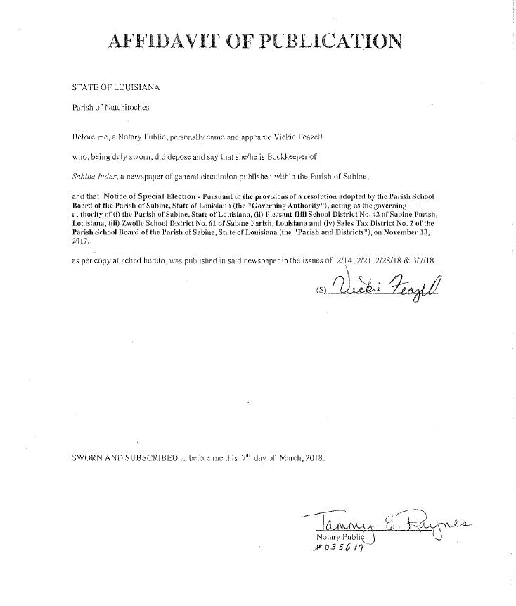 Pursuant to the provisions of a resolution adopted by the Parish School Board of the Parish of Sabine, State of Louisiana (the "Governing Authority"), acting as the governing authority of (i) the Parish of Sabine, State of Louisiana, (ii) Pleasant Hill School District No. 42 of Sabine Parish, Louisiana, (iii) Zwolle School District No. 61 of Sabine Parish, Louisiana and (iv) Sales Tax District No. 2 of the Parish School Board of the Parish of Sabine, State of Louisiana (the "Parish and Districts"), on November 13, 2017, NOTICE IS HEREBY GIVEN that special elections will be held within the Parish and Districts on SATURDAY, APRIL 28, 2018, and that at the said elections there will be submitted to all registered voters in the Parish and Districts qualified and entitled to vote at the said elections under the Constitution and Laws of the State of Louisiana and the Constitution of the United States, the following propositions, to-wit: